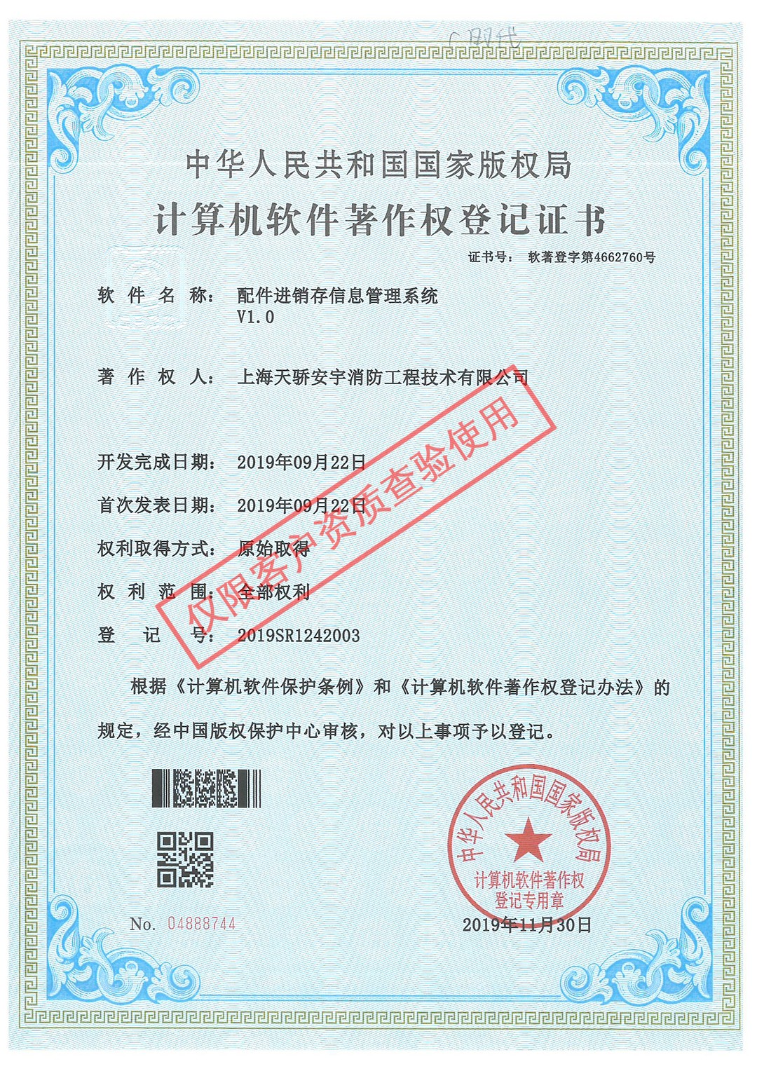 天驕消防安全智能管理系統(tǒng)軟件著作權(quán)天驕配件進銷存信息管理系統(tǒng)軟件著作權(quán)天驕智慧消防服務(wù)綜合管理系統(tǒng)軟件軟件著作權(quán)天驕智慧消防自動派單軟件著作權(quán)天驕智慧消防信息采集軟件著作權(quán)天驕安宇安全管理軟件著作權(quán)